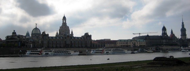 We walk along the north shore of the Elbe River in the afternoon. It is overcast, the leaves are starting to turn and the cold wind signals autumn has arrived. A recent flood has left debris on the shoreline and the sounds of a street festival echo in the distance. We look south, beyond the swift but receding current, at the restored old sandstone city. Transformed from a scarred and neglected victim of war just a generation ago, it now glows in a brilliant new light, fresh colors and newborn hope.