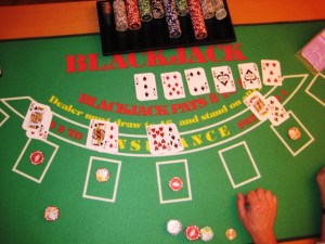 One recent gaming round over the holidays included friends of ours who will travel with us to Sin City next May to make their debut at the Luxor. We are teaching them how to play the game by the book, so that they will hopefully make a decent impression, and won’t be run out of town. In a best-case scenario they’ll be able to finance their hotel stay with the winnings. That means following a strategy which mathematically increases one’s probability of beating the house by as little as 0.1 percent – even if the book’s “rules” are occasionally rather counter-intuitive. This is the part that’s sometimes tough to wrap one’s head around.