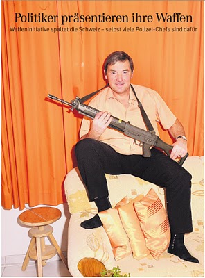 The Swiss military’s standard-issue automatic weapons are very present in everyday public life, on public transport and in the public consciousness. In Zurich, men carry around their army rifles like women carry around their Louis Vuitton handbags. Last Sunday’s newspaper even featured photographs of prominent Swiss politicians sitting on their sofas – in stinky socks, no less – and cradling their firearms.