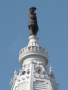 Though dwarfed by the gleaming office towers that have grown up around him in the past two decades, William Penn still stands tall atop of City Hall at the intersection of Broad and Market Streets. It’s good to see him up there. Enough to make me feel whole again.