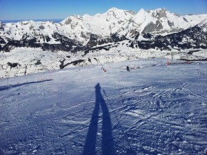 The temperature was minus 12 degrees Celcius (10 degrees F) in the valley when I headed out last Monday morning. When I finally got to the top, at 2200 meters (7260 feet) above sea level it was, of course, wonderful. I snapped into my bindings and started swishing down the pistes like a pro. (Okay, no, not really…)